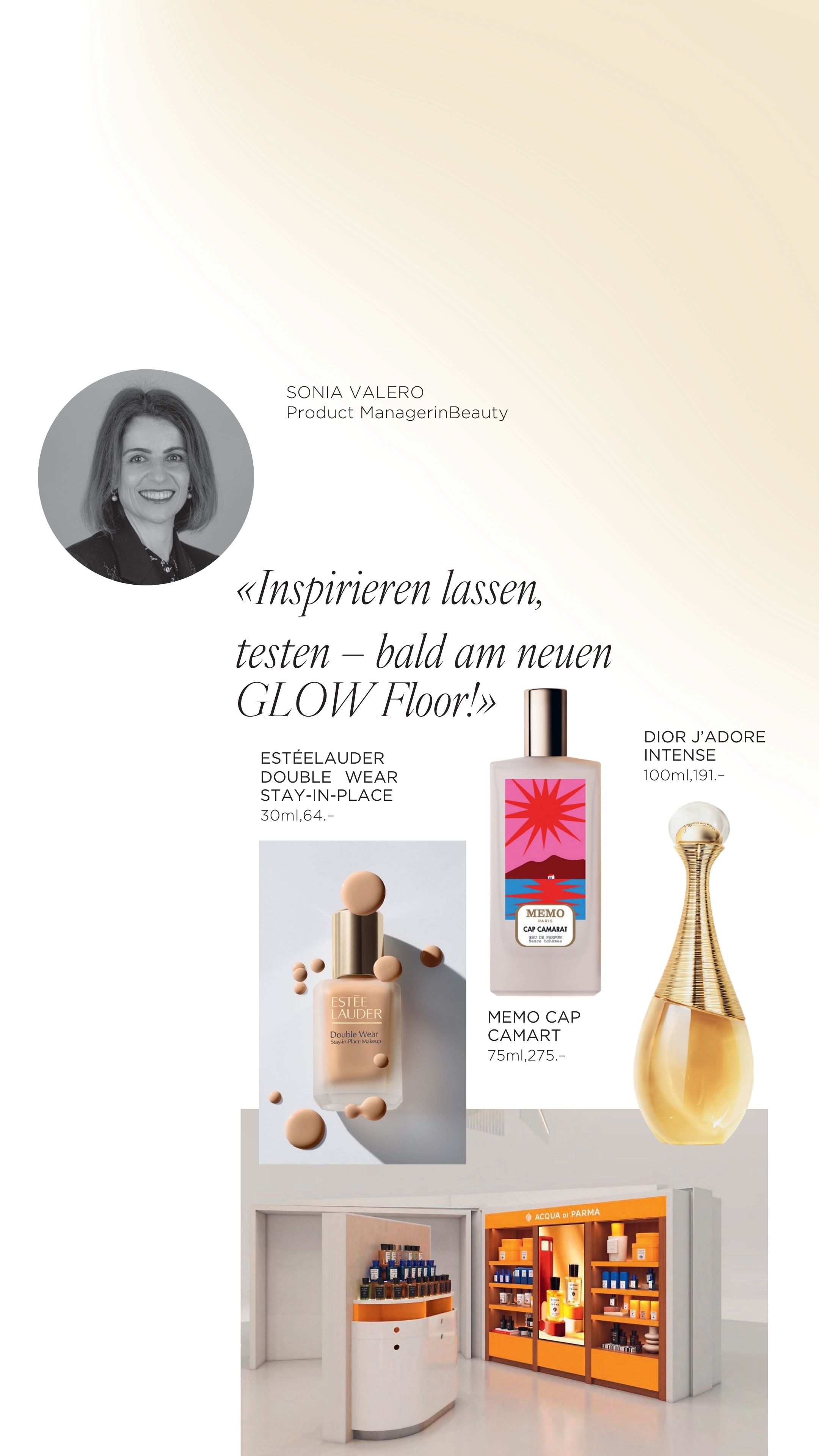 Ja, das stimmt. Als ich zum ersten Mal von der Idee des Glow Floors gehört habe, war ich sofort begeistert. Ein Projekt dieser Grösse, das Beauty neu interpretiert und Duft, Pflege sowie Make-up zu einem ganzheitlichen Erlebnis verbindet. Genau diese Mischung aus Ästhetik, Emotion und Inspiration begeistert mich. Beauty ist für mich nicht nur Produkt, sondern Ausdruck, Stimmung und Freude im Alltag.